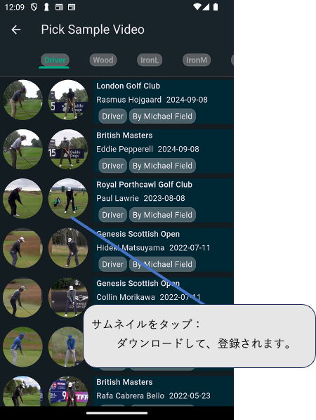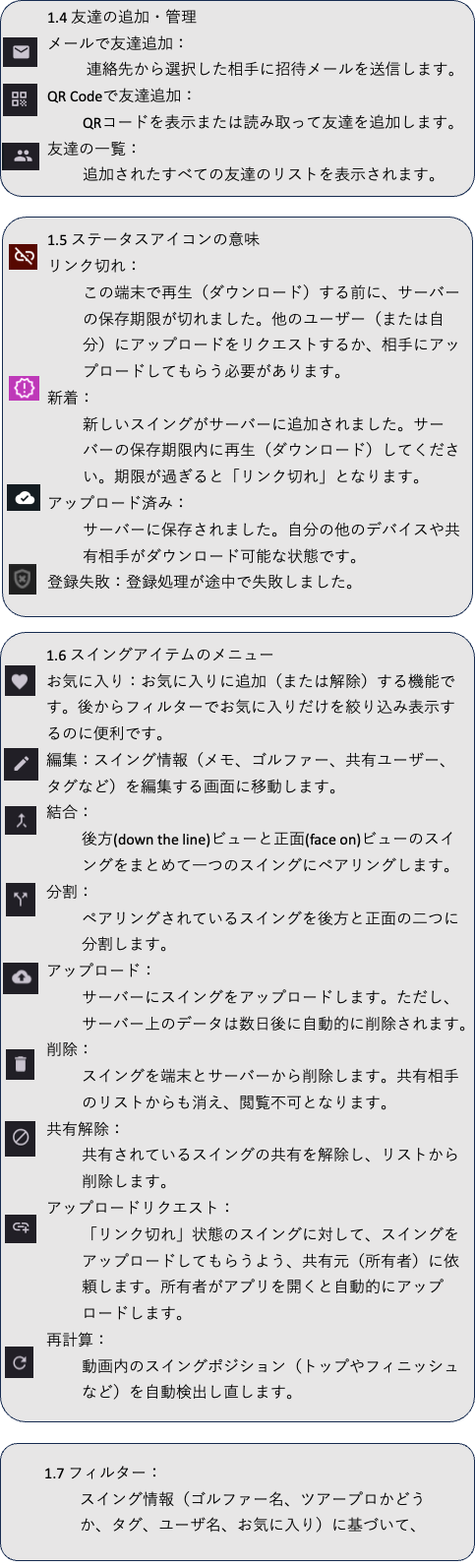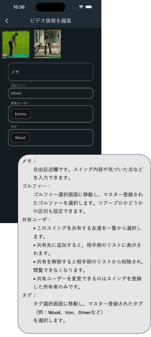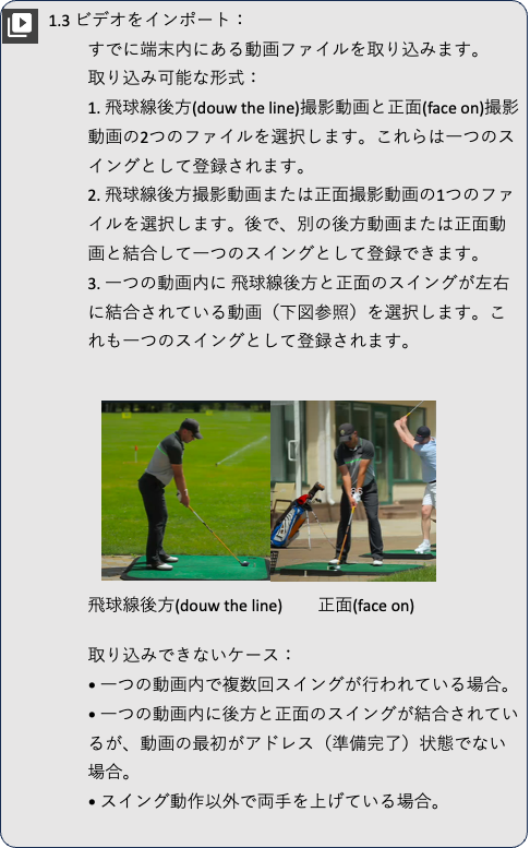 【Golf Swing Reel】ガイド 2024.12.012025.05.25 1. スイング一覧画面 2. カメラによる スイングの自動撮影画面 3. 再生画面 4. スイング情報の編集 5. ツアープロのスイングのダウンロード